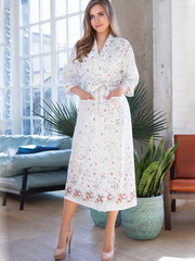 Халат домашний женский Миа-Миа выполнен из нежного принтованного хлопка. Модель свободного силуэта длиной на середину голени. Воротник шалька, рукав прямой длиной 3/4. Халат завязывается на пояс и внутреннюю завязку. Модель с накладными карманами впереди.